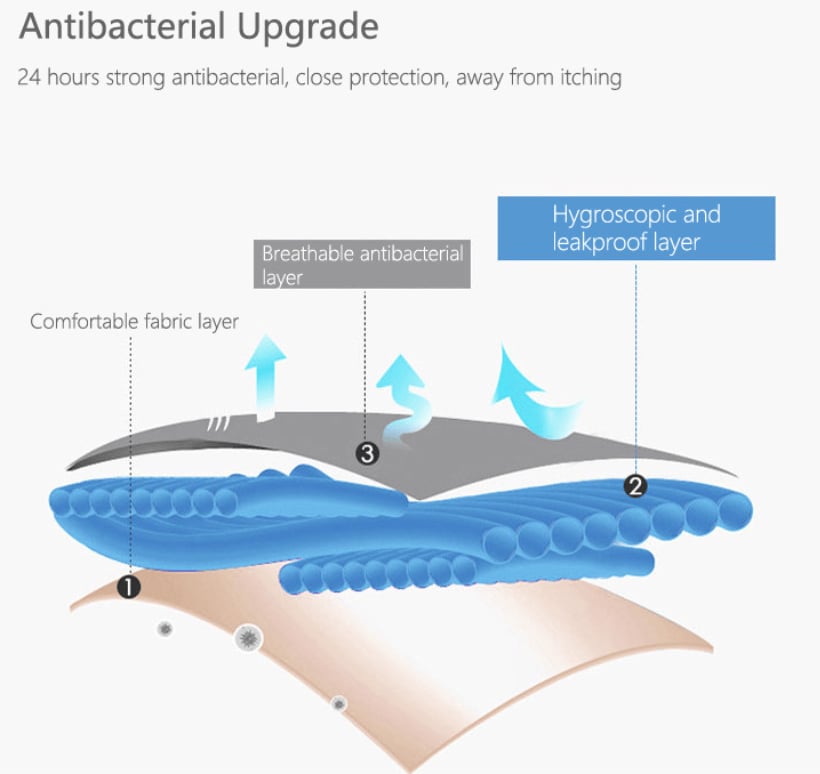 Our panties come with three layers of leak-proof protection material: